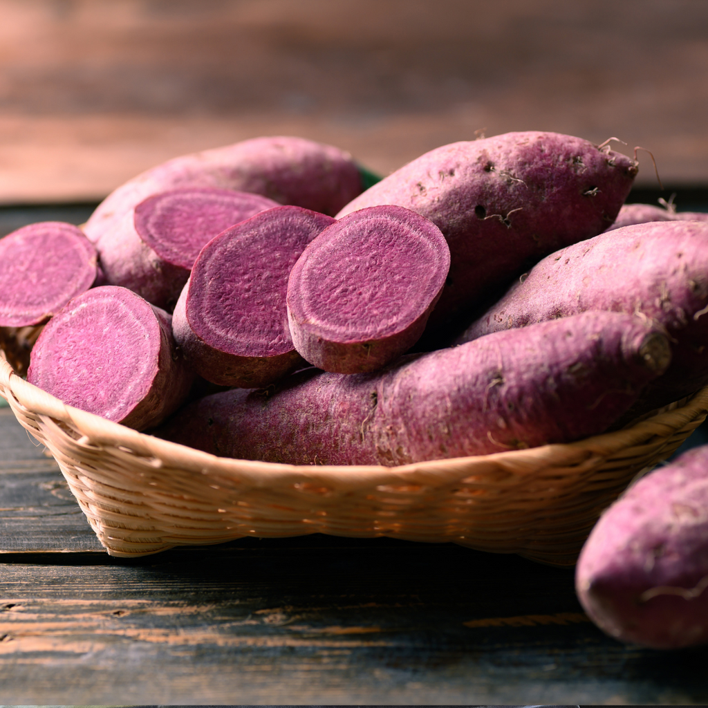 Purple sweet potatoes are a vibrant and nutritious variety of sweet potato. They have a rich, deep purple skin and bright purple flesh. When cooked, their color can range from a rich violet to a softer lavender hue. They tend to be slightly sweeter than traditional sweet potatoes, with a creamy texture that becomes even more pronounced when baked or mashed.